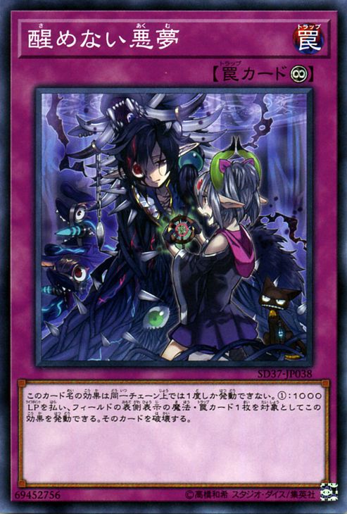 遊戯王 ストラクチャー・スターターデッキ 「リバース・オブ・シャドール」(SD37)収録 ■カード名:醒めない悪夢 【永続罠】ノーマル ■「醒めない悪夢」の効果は同一チェーン上では1度しか発動できない。