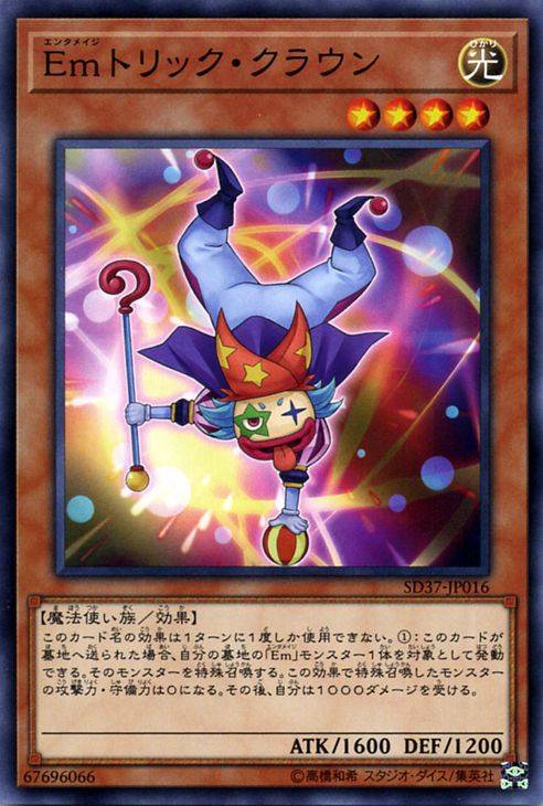 遊戯王 ストラクチャー・スターターデッキ 「リバース・オブ・シャドール」(SD37)収録 ■カード名:Emトリック・クラウン 【効果モンスター】ノーマル ■星4/光属性/魔法使い族/攻:1600/守:1200/ ■「Emトリック・クラウン」の効果は1ターンに1度しか使用できない。